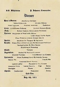 Wilhelmina—a steel-hulled, single-screw, passenger and cargo steamer built at Newport News, Virginia, by the Newport News Shipbuilding and Drydock Co. for the Matson Navigation Company—was launched on 18 September 1909 and departed her builders' yard on 7 December of that year. Under the Matson flag, Wilhelmina conducted regular runs between San Francisco, California, and Honolulu, Hawaii, carrying passengers and cargo between 1910 and 1917. SS Wilhelmina is referenced in a book called From Job to Job Around the World, written by Alfred C.B. Fletcher. Gutenburg EBook #55336.