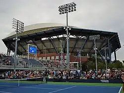 Court 4 with Arthur Ashe Stadium in the background at The United States Tennis Association's Billie Jean King National Tennis Center.