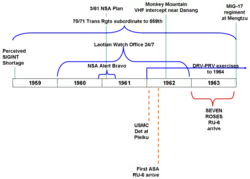There are several ways to split US SIGINT regarding Southeast Asia into periods. Gilbert's four periods are focused on the deployment of American units. In contrast, Hanyok's periods, although the redactions make it difficult to see exactly why he created chapters as he did, but it would appear that he ties them more to VC/NVA activities, as well as RVN politics, than the US view.