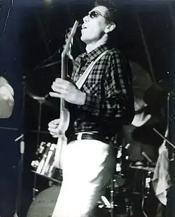 In 1980, the band was renamed U škripcu (In Dire Straits)—choosing this name as they had frequent problems with equipment and lack of money[2]—adding drummer Miloš Obrenović, and soon after bass guitarist Aleksandar Lukić "Luka" to the lineup.[2] The band's first recordings, tracks "Južno voće" ("Tropical Fruit") and "Pamflex dom" ("Pamflex Home"), were released in 1981 on the Artistička radna akcija (Artistic Work Action) compilation, which featured the second generation of Belgrade new wave bands.[2] At the beginning of their career the band developed the "Pamflex" concept. Pamflex was an imaginary company, invented by Delčić, with the band's songs representing commercials for the company's imaginary products.[2] The band described advertising as the finest form of art and introduced elements of theatre into their live performances, with reading ironic and comical speeches, playing accordion and using Pamflex flags.[2] During 1981, the band had numerous live appearances in Belgrade and Zagreb clubs, and soon established a loyal fanbase.[2]