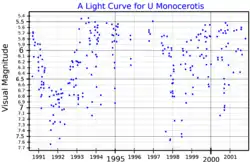 U Mon was reported to be variable in 1918 by the renown German astronomer Ernst Hartwig.[10] It was then included by Shapley in his list of Cepheid variables.[11] In the 1950s a series of papers established the fundamental observational parameters of the star, its period, brightness range, colour changes, and spectral variation.[4][12][13]