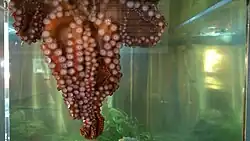 The feature display animal is the Giant Pacific Octopus, which at this northern latitude ranges to near the surface. Other animals central to the displays are various rockfish species, crabs, bivalves, feather duster worms, bay pipefish, sea anemones, and the sea pen. Interesting species sometimes displayed include the spotted ratfish, Humboldt squid, basket star, spot prawn, and red octopus. In addition, because the aquarium continuously pumps raw sea water through its exhibits, planktonic larvae of all sorts settle out in the exhibits, providing an ever-changing challenge of interesting discoveries. Of particular abundance are the opalescent nudibranch and sand-dwelling shellfish species like clam larvae, which grow into juvenile clams over the summer and are then returned to the beach.