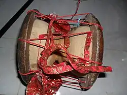 Udukku is a smaller version of Edakka, shaped like an hour glass.[2] The instrument is about 8 to 10 inches long with a girth of 6 to 8 inches on both ends and tapering towards the centre.[3][4] The body of the instrument is traditionally made out of kiln fired clay but later variants are made of wood, preferably from a single hollow block of Jackfruit wood. Brass bodies are also used in some parts.[2] The ends of the instrument is covered across the mouth with cured and dried animal hide, goat skin is the preferred leather. Hoops are placed on the edge of the instrument body and the skin is tightened using strings woven from end to end.[2] Udukku is played on one side and the non playing side is provided with one or two metallic wire snares, enabling the player to generate more resonance. A strap made of cloth is fixed to the middle of the instrument for clasping it. Coloured balls made of cotton strings are also placed hanging from the instrument as an embellishment.[3]