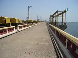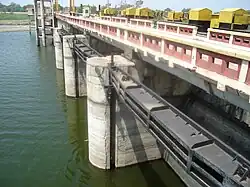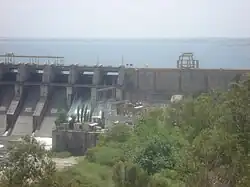 The Ujjani Dam commissioned in June 1980 is an earth cum concrete masonry dam, which has created a multipurpose reservoir. The total length of the dam is 2,534 m (8,314 ft), which comprises a central portion which is the spillway dam of 602 m (1,975 ft) length, of concrete gravity section of 56.4 m (185 ft) (maximum height above the deepest foundation level). The spillway is flanked by Non Overflow (NOF) concrete gravity dams of 314 m (1,030 ft) length. Earth dam sections flank the NOF dams on the left and right banks. The volume content of the dams is 3.320 km3 (0.797 cu mi). The gross storage capacity created is 3.320 km3 (0.797 cu mi) at the Full Reservoir Level (FRL) of 497.58 m (1,632.5 ft).[1] The spillway, structure has an Ogee shaped downstream slope designed to dispose a design flood discharge of 15,717 m3/s (555,000 cu ft/s) (the maximum probable flood discharge of 18,013 m3/s (636,100 cu ft/s) and a breaching section is provided between the NOF block and the earth dam section, controlled by 41 radial gates of 12 m (39 ft)x6.5 m (21 ft) size erected over the crest of the dam. In addition, four river sluices (gate controlled) are also provided in the body of the spillway pier numbers 3, 4, 5 and 6 with outlet level at 470 m (1,540 ft), with each sluice designed for a discharge capacity of 60 m3/s (2,100 cu ft/s) for silt flushing. The energy dissipation arrangements on the downstream slope of the spillway is in the form of high level and low level slotted roller bucket type. Measuring instruments have been installed in the body of the dam to record and analyse various parameters related to the behaviour of the dam over the years as part of the dam safety programme[1][4] The dam is founded on massive basaltic rock formations.
