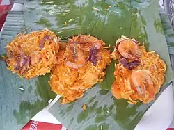 The most basic traditional okoy recipe uses a small amount of galapong (ground soaked glutinous rice) as the batter, spiced to taste with onion, garlic, salt, and scallions. It is mixed with mashed kalabasa (calabaza) and unshelled small shrimp. They are deep-fried as small flat patties until golden brown. Excess oil is drained on paper towels and the dish is served warm and crispy.[5] Okoy batter can also be mixed with kamote (sweet potato) or kamoteng kahoy (cassava), instead of, or in addition to calabaza. Other ingredients are also traditionally added, including mung bean sprouts (togue) and/or julienned carrots, onions, and green papaya.[6][7] The dish is sometimes dyed bright orange with achuete seeds.[1]