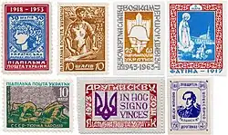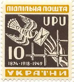 The Ukrainian People's Republic issued its own postal stamps during the 1910s and 1920s until its dissolution as did the Western Ukrainian People's Republic. In comparison, the Ukrainian Soviet Socialist Republic did not issue its own stamps but had become a member of the Universal Postal Union in 1947. The German occupation administration in Ukraine had also issued its own stamps for circulation in Ukraine during World War II.[6] Exiled Ukrainian stamps had a history extending back to the late 1940s from displaced persons camps in Germany and Italy.[7]