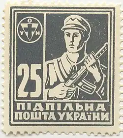 The Ukrainian Underground Post (Ukrainian: Підпільна пошта України, converted in Ukrainian Latin alphabet to Pidpilna Poshta Ukrainy (abbeviation: PPU)),[9][8] also known as the Underground Post of Ukraine, was founded by Ukrainian exiles from West Germany in 1949 under a branch of the Organisation of Ukrainian Nationalists.[10] According to PPU stamp cataloguer and philatelist Stefan Golash, Regensburg resident and former 14th Waffen Grenadier Division of the SS (1st Galician) volunteer Stepan Liubomyr Rychtyckyj (writing under the pseudonym Stefan Liubomyrsky) first took interest in writing and philately while he and his former division were interred in a prisoner of war camp in the Italian city of Rimini until his release in 1946. In 1949, he met Ukrainian philatelist and fellow Regensburg resident Julian Maksymchuk, who with the latter's influence and guidance established the postal agency, which released its first set of stamps the same year.[10][8] As an internationally unrecognized postal agency, the Underground Post of Ukraine issued non-state postage stamps that were primarily used for propaganda purposes.[7]