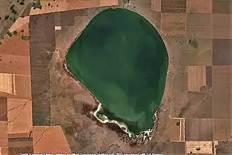 The southern shore of the lake lies very close to the border with Kostanay Region. Timiryazevo town, the administrative center of the district, lies 25 kilometers (16 mi) to the northeast of the lake.[2][3]