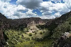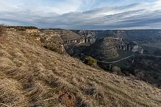 Ulubey Canyon covers an area of 119 hectares (290 acres).[1] It is 100–500 m (330–1,640 ft) wide and 135–170 m (443–558 ft) deep, with a total length of 40–45 km (25–28 mi).[2] The streams Ulubey Creek and Banaz Creek (tributaries of Büyük Menderes River) run through the Ulubey Canyon.[1] The main canyon along both creeks has tens of big lateral canyons.[1] The walls of the canyon are 10–30 m (33–98 ft) and 50–55 m (164–180 ft) high. At least three terraces are visible in the canyon walls. In addition, there are many conical karstic hills along the canyon.[2]