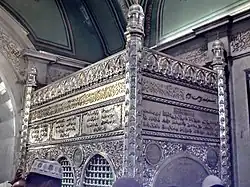 Its appearance may have been imitated by other surviving mihrabs built under the Mamluk sultans al-Mansur Qalawun and al-Nasir Muhammad in the 13th and 14th centuries, such as the richly decorated mihrab of Qalawun's mausoleum in Cairo (completed in 1285).[67] Scholars generally assume that the mihrab described by Ibn Jubayr dated from a restoration of the mosque in 1082.[66] Another restoration occurred after 1401 and this version, which survived until another fire in 1893, was again decorated with miniature arcades, while its semi-dome was filled with coffering similar to Roman architecture.[66][68] Finbarr Barry Flood has suggested that the perpetuation of the mihrab's arcaded decoration across several restorations indicates that the medieval restorations were aimed at preserving at least some of the original mihrab's appearance, and therefore the 8th-century Umayyad mihrab may have had these features.[66]