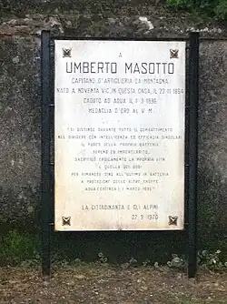 Captain Masotto remained with his gunners and was intrepid during the strenuous fight to protect retreating infantry units as when all hope was lost, he went with serene courage to sacrifice his life. He fell on a cannon, with the pistol in his right hand before being pierced by the spears and sabres of the Ethiopian forces as his officers and soldiers joined him in a last stand, using up all the ammunition of their 14 guns before meeting a similar fate. For this action, Masotto was posthumously awarded the Gold Medal of Military Valour on March 11, 1898.[1][5] The Technical Commercial Institute of Noventa Vicentina was also entitled to the heroic figure of the soldier.[6]