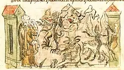 One of the euphemisms for unclean force is "undead".[1] The concept was described in the Explanatory Dictionary of Vladimir Dal and included humanoid spirits such as: Domovoy, Polevik, Vodyanoy, Leshy, rusalka, kikimora and others, but did not include the rising dead, ghosts, chorts. Vladimir Dal wrote in his explanatory dictionary: "According to the expression of peasants, the undead do not live and do not die. The undead do not have their own appearance, it walks in disguise. All undead are speechless". In Slavic demonology, they are counted among the demons.[11] Other sources slightly different interpretation of the concept, attributing to it, for example, chorts.[12][13]