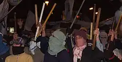 The practice began in Argentina in the mid-1990s during the administration of President Carlos Menem, soon becoming a frequent form of protest that still prevails on the South American socio-political scene.[1] In 2005, it was reported that 70% of the piqueteros are women,[2] and some of their leaders are women too, like Milagro Sala from Jujuy.