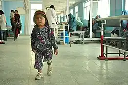 A girl with a congenital, structural difference in leg lengths walking in a clinic.