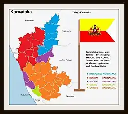 The Unification of Karnataka or Karnataka Ekikarana refers to the formation of the Indian state of Karnataka (then named Mysore State) in 1956 when several Indian states were created by redrawing borders based on linguistic demographics. Decades earlier during British rule, the demand for a state based on Kannada demographics had been made.