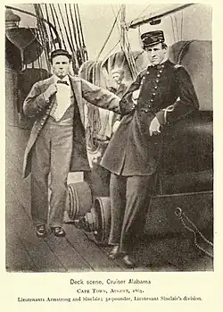 The first of the Navy uniforms were made in dark blue, but with the Southern style of rank insignia for the officers. The 1862 Confederate regulations ordered the uniform to be steel gray and lined with a dark black silk serge. They were also made in medium gray and cadet gray. They were made of wool, and these uniforms were not fit for the heat of the lower decks of a ship.[11] Petty officers wore a variety of uniforms, or even regular clothing.[12]
