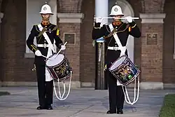 This is normally worn only by the Royal Marines Band Service, while the simpler Number 1A dress or "blues" are worn by any other Royal Marine unit undertaking ceremonial duties.[23] The Full Dress dates from 1923 and consists of a royal blue single-breasted tunic with red facings (with gold piping) and yellow cuff slashes. Royal blue trousers with a scarlet stripe and a white pith helmet are also worn. The uniform of the drum major features hussar style braiding across the front of the tunic. This uniform is also worn by the corps of drums of the Royal Marines Volunteer Cadet Corps.[24]
