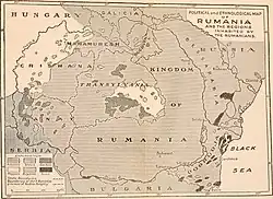 During the peace talks between the Great Powers and Romania, on 1 February 1919, British Prime Minister David Lloyd George talked with Ion I. C. Brătianu and, after the withdrawal of the Romanian government's delegation, Lloyd George proposed that Romania's claims be analyzed by a territorial commission that would examine historical, ethnographic, geographic, strategic, but not political facts.[15] The Territorial Commission on Romanian Affairs was formed, by which the representatives of the Big Four Powers presented their proposals and decided Romanian's territorial future. The commission was formed by Clive Day and Charles Seymour (USA), Sir Eyre Crowe and Alan Leeper (United Kingdom), André Tardieu and Guy Laroche (France), and Giacomo De Martino and Count Luigi Vannutelli-Rey (Italy). During the debates the only issue related to Romania on which the representatives agreed was that Bessarabia should belong to Romania.[16] However, the United States refused to sign the Treaty on the grounds that Russia was not represented at the conference.[17] The newly communist Russia did not recognize Romanian rule over Bessarabia,[17] a stand that was tacitly accepted by many other countries such as the United States.