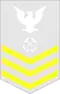 The dress blue insignia consists of a perched eagle (or "crow") with spread wings atop a rating mark, with three chevrons and one "rocker" above the rating mark. Inverted five-point stars above the crow denote the rank of senior chief (one star) or master chief (two stars). All other uniforms use the collar device to denote rank. It consists of a foul anchor with the initials U S N in silver, superimposed, with stars above the anchor to indicate higher pay grades, similar to the dress blue insignia.[14]