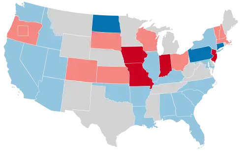 | R38 N.J. (sp) Gain | R37 Mo. Gain | R36 Iowa Gain | R35 Ind. (sp) Ind. (reg) Gain | R34 Wisc. Re-elected | R33 Vt. Re-elected | R32 S.D. Re-elected | R31 Ore. (sp) Elected[b] | R30 Ore. (reg) Hold | R29 Ohio Re-elected |