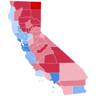 Vice President Al Gore easily defeated Texas Governor George W. Bush in California. Bush campaigned several times in California, but it didn't seem to help as Gore defeated Bush by 11.8%. Bush did make substantial headway in the Gold Country, Shasta Cascade, and parts of the Central Valley, flipping San Joaquin, Stanislaus, and Merced Counties (all of which had voted for Bill Clinton twice) and winning the highest vote share of any presidential nominee in decades (exceeding California natives Richard Nixon and Ronald Reagan) in Shasta, Madera, Tehama, Siskiyou, Lassen, Plumas, Modoc, and Sierra Counties. He also flipped San Bernardino County, his largest county flip in the state (and nationally), as well as Ventura County; but he underperformed in all the large, then-historically Republican counties of Southern California and the Central Coast (San Diego, Orange, Riverside, San Bernardino, Ventura, Santa Barbara, and San Luis Obispo) relative to Bob Dole's performance in 1996, losing Santa Barbara outright despite that Dole had lost it by only 4.5%.[5] In the then-Republican bastion of Orange County, Al Gore became the first Democrat to crack 40% since Lyndon Johnson's 1964 landslide.