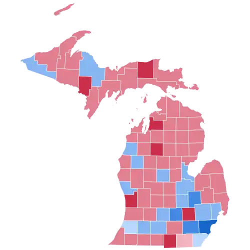 Michigan was won by Democrat Barack Obama with 54.21% of the vote to Romney's 44.71%, a victory margin of 9.50%.[2] It was the sixth presidential election in a row where Michigan voted in favor of the Democratic candidate, with Republicans last carrying the state in 1988. Obama's margin of victory was significantly decreased from 2008 when he carried the state by 16.44%, and he lost 26 counties that had voted for him four years prior. Many of those counties had gone Democratic for the first time in decades, such as Berrien County, which had not voted for a Democrat since Lyndon B. Johnson in 1964. As of the 2024 presidential election, this is the last time that Wayne County, the state’s most populous county and home to Detroit, was the most Democratic county in Michigan; and the last time that Bay County, Calhoun County, Eaton County, Gogebic County, Isabella County, Lake County, Macomb County, Manistee County, Monroe County, Shiawassee County, and Van Buren County voted for the Democratic candidate. It is also the last time either party carried Michigan by more than 3%.