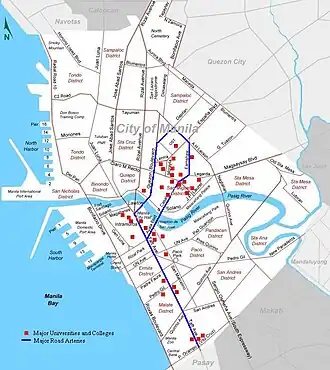 The University Belt is a de facto subdistrict in Manila, Philippines, referring to an area with a significant concentration of major colleges and universities in the city.[1] The districts of Quiapo, Sampaloc, and San Miguel are traditionally considered areas of the University Belt.[2] Other clusters of schools along the southern bank of the Pasig River, mostly in the districts of Intramuros and Ermita and the southernmost part of Malate near the city limits, are also sometimes included.[3] Each of the colleges and universities in the district is within walking distance of each other.