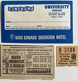 The University Theatre opened on 25 March 1949,[1] and aimed to be the premier cinema in the city. It was a single screen theatre with seating for 1300 people. The cinema would host many of the most important films of its day. For major productions it would use reserved seating where patrons would buy specific seats ahead of time.[1] The cinema also helped introduce new technologies to Toronto such as CinemaScope, Cinerama and 70 mm film Dolby Stereo.[1][2]