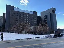 In 1915 the hospital was rebuilt as Cincinnati General Hospital and moved to a more spacious campus on a hilltop in Corryville, away from the canal and closer to the University of Cincinnati.[6] The new structure was patterned after European examples such as the Virchow hospital in Berlin, and became influential on the design of other hospitals in the United States.[11] It was divided into numerous pavilions that each held a separate clinical specialty.[12]