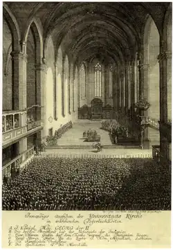 The initial university infrastructure was modest, comprising only a riding hall and a fencing house, with lectures held in the Paulinerkirche, Dominican monastery, or professors' homes. A university auditorium wasn't constructed until the 19th century.[9]