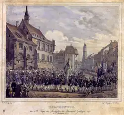 However, political disturbances, in which both professors and students were implicated, lowered the attendance to 860 in 1834. The expulsion in 1837 of the seven professors – the so-called Die Göttinger Sieben (the Germanist Wilhelm Eduard Albrecht (1800–1876), the historian Friedrich Christoph Dahlmann (1785–1860), the orientalist Georg Heinrich August Ewald (1803–1875), the historian Georg Gottfried Gervinus (1805–1875), the physicist Wilhelm Eduard Weber (1804–1891), and the philologist brothers Jakob (1785–1863) and Wilhelm Grimm (1786–1859)) – for protesting against the revocation by Ernest Augustus, King of Hanover, of the liberal constitution of 1833 hurt the reputation of the city and the university.[14]