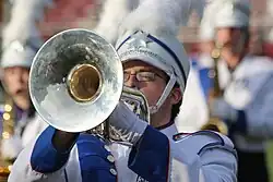 The instrumentation consisted of piccolos, alto saxophones, tenor saxophones, trumpets, mellophone, trombones, baritones, sousaphone, and a variety of percussion instruments.[1]