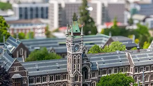 The University of Otago's main campus is in Dunedin, which hosts the Central Administration as well as its Health Sciences, Humanities, Business School, and Sciences divisions.[46] The architectural grandeur and accompanying gardens of the main campus in Dunedin led to its being ranked as one of the world's most beautiful university campuses by the British newspaper The Daily Telegraph and American online news website The Huffington Post.[47][48] In addition, the university has four satellite campuses in Auckland, Wellington, Christchurch, and Invercargill.[46]