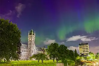 The Registry Building (Clocktower Building), looking east.In the early hours of 2 January 2025, from about 1–3 am, the Southern Lights (Aurora Australis) lit up the sky above the iconic Clocktower Building at University of Otago.Aerial view of the Dunedin campus. The Water of Leith runs through in the centre.Dunedin campus in winter - unusually thick snowfallAerial shot over the University of Otago, Dunedin. 2024Logo of the University of Otago used until 2024