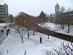 Otago students are notable for protesting over contentious political issues in nearly every decade. In the 1960s students at Otago who were involved with the Progressive Youth Movement led protests against the Vietnam War. In the 1960s mixed flatting (males and females were prohibited from sharing housing up to that time) was contested in various creative ways by Otago students.[100] On 28 September 1993 Otago students protested against a fee increase at the University Registry (Clocktower Building), which ended in a violent clash with police.[101] In the lead up to the 1996 general election students trying to stop a 25% fee increase occupied the University Registry (Clocktower Building) for over a week (which was followed by similar occupations at campuses around the country), fee increases were limited to 17%.[102] Since 2004, the Otago University NORML club, led by Abe Gray,[103] met weekly on the Otago campus to protest by smoking cannabis in defiance of New Zealand's cannabis laws. In 2008, several members were arrested and issued with trespass notices banning them from the Union Lawn.[104][105][106]