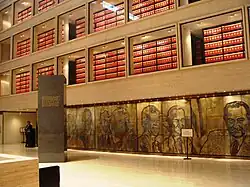 The university's seven museums and seventeen libraries hold over nine million volumes, making it the seventh-largest academic library in the country.[94] The holdings of the university's Harry Ransom Humanities Research Center include one of only 21 remaining complete copies of the Gutenberg Bible and the first permanent photograph, View from the Window at Le Gras, taken by Nicéphore Niépce.[95] The newest museum, the 155,000-square-foot (14,400 m2) Blanton Museum of Art, is the largest university art museum in the United States and hosts approximately 17,000 works from Europe, the United States, and Latin America.[96][97] The Perry–Castañeda Library, which houses the central University Libraries operations and the Perry–Castañeda Library Map Collection, is at the heart of campus. The Benson Latin American Collection holds the largest collection of Latin American materials among US university libraries,[98] and maintains substantial digital collections.[99]