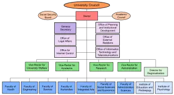 Academic affairs are overseen by the Academic Council, which is formed of seventeen members: The rector, the general secretary, the vice-rectors for Academics, Administrative Affairs, Research, and University Welfare; the deans of the eight faculties; the directors of the two institutes and the offices of Planning and Regionalisation; two representatives for the professors, one representative for academic programs, and two representatives for the students.[38]
