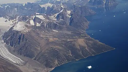 The island is very mountainous.[2] Its highest point is Palup Qaqaa, an ultra-prominent peak at 71° 20' 24 N, 52° 48' 37 W reaching 2,007 m (6,585 ft).[3]