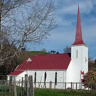 The schoolroom functioned for Anglican services in the mid 1870s, but in 1877 St Mary's Anglican Church was built. Designed by local architect Edward Morgan and built by John Randal, St Mary's is distinctive in having a spire with a triangular cross-section, on a four-sided steeple. Its stained glass window was installed in 1879, in memory of Archibald Montgomery, a young Upokongaro man lost in the sinking of the clipper Avalanche in the English Channel just before the church was completed.[4] St Mary's is the oldest church in the Whanganui District on its original site.[5]