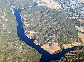 The reservoir was originally formed in 1926 when the first San Leandro Dam was completed, and it was first filled by the Mokelumne Aqueduct in 1929.[4] It inundated a long section of the San Leandro Creek valley, including the towns of Valle Vista and Redwood. The original dam was constructed between 1924 and 1926 using the hydraulic fill method and was considered seismically inadequate.[5]