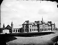 The old station building was designed by Adolf W. Edelsvärd, who described its architecture as "Dutch Renaissance-style".[2] Along with the accompanying railway, the station was opened in September 1866 by king Charles XV.[3] Originally, the building had an adjoining rail depot with a tower in each corner, however this was demolished in 1918. The building has been expanded twice, once in 1889 and again in 1918. The ground floor was renovated completely 1934–35.[2] In 1986, the building was listed (protected as a cultural heritage) by the Swedish Government.[4] After the station building became defunct in 2011, a brasserie opened in the building.[5]