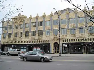 The Uptown Broadway Building is a historic three-story building at 4703–4715 North Broadway in Uptown, Chicago.[2] Built in 1926, it was designed by Walter W. Ahlschlager and is known for its ornate terra-cotta facade depicting ancient gods, rams' heads, shields, helmets, birds, fruits, and trophies.[3] Lynn Becker of the Chicago Reader has called the exterior "a riotous, Spanish-baroque-inspired hallucination".[4] According to unconfirmed local legends, Al Capone operated a speakeasy in the building's basement.[3]