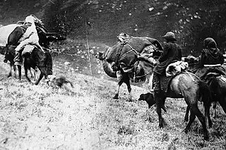 In the eastern part of Russian Turkestan, tens of thousands of surviving Kyrgyz and Kazakhs fled toward China. In the Tien-Shan Mountains they died by the thousands in mountain passes over 3,000 meters high.[26] The expulsion of Central Asians by Russian forces had its roots in Tsarist policy of ethnic homogenization.[27]