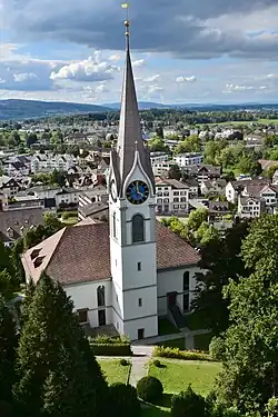 The present church was designed by the architect John Volkart as a cross church in Classicism style. Accessible via a monumental staircase, the transverse church has a massive portico of four columns in Tuscan order and an upstream buttress. In addition to the three portals of the main facade, there are also side portals and raised access on the northeastern side of the tower. The tower has a pointed spire and scalloped gable. The church tower has a height of 54 metres (177 ft) and was added in 1827. The peal consists of four bells, cast in Zürich and consecrated on 27 August 1882. The watch face has a diameter of about 4 metres (13 ft).[3]