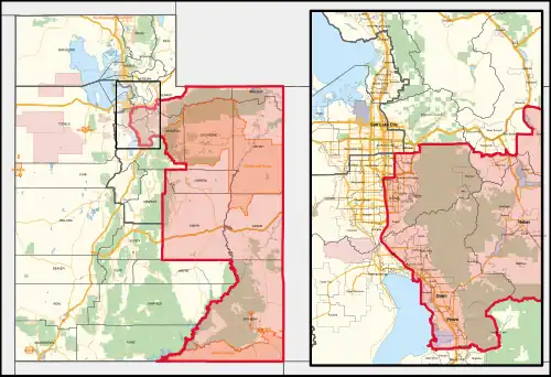 References ^ Center for New Media & Promotion (CNMP), US Census Bureau. "My Congressional District" . www.census.gov . ^ "2025 Cook PVI℠: District Map and List (119th Congress)" . Cook Political Report . Retrieved April 5, 2025 . ^ "DRA 2020" . davesredistricting.org . Retrieved August 18, 2025 . ^ Tribune, Courtney Tanner And Lee Davidson The Salt Lake. "Utah sets condensed special election calendar – and it's already started" . The Salt Lake Tribune . Retrieved May 22, 2017 . ^ Clerk of the House of Representatives (May 5, 1983). "Statistics of the Congressional Election of November 2, 1982" (PDF) . U.S. Government Printing Office . ^ "1984 Election Results" (PDF) . ^ "1986 Election Results" (PDF) . ^ "1988 Election Results" (PDF) . ^ "1990 Election Results" (PDF) . ^ "1992 Election Results" (PDF) . ^ "1994 Election Results" (PDF) . ^ "1996 Election Results" (PDF) . ^ "1998 Election Results" (PDF) . ^ "2000 Election Results" (PDF) . ^ "2002 Election Results" (PDF) . ^ "2004 Election Results" (PDF) . ^ "2006 Election Results" (PDF) . ^ "2008 Election Results" (PDF) . ^ "2010 Election Results" (PDF) . ^ "2012 Election Results" (PDF) . ^ "2014 Election Results" . ^ "2016 Election Results" . Archived from the original on January 13, 2023. Retrieved February 10, 2017 . ^ "Utah Election Preliminary Results" . State (Utah). Archived from the original on December 24, 2017. Retrieved December 23, 2017 . ^ "2018 General Election Canvass" (PDF) . Archived from the original (PDF) on April 16, 2021. Retrieved June 18, 2022 . ^ "Election results" . Archived from the original on January 13, 2023. Retrieved February 10, 2017 . ^ "US Congressional District 3" . Utah Election Preliminary Results . Archived from the original on January 13, 2023. Retrieved December 14, 2022 .