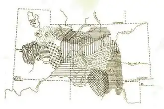 In 1868, the U.S. federal government established reservation in Colorado.[45][51] Indian agents tried to get the Utes to farm, a dramatic lifestyle change which lead to starvation due to crop failures.[45] Their lands were whittled away until only the modern reservations were left. A large cession of land in 1873 transferred the gold-rich San Juan area, which was followed in 1879 by the loss of most of the remaining land after the "Meeker Massacre".[45][51] Utes were later put on a reservation in Utah, Uintah and Ouray Indian Reservation,[52] as well as two reservations in Colorado, Ute Mountain Ute Tribe and Southern Ute Indian Reservation.[53]
