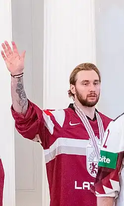 He represented Latvia at the 2023 IIHF World Championship where he recorded two assists and won a bronze medal, Latvia's first ever IIHF World Championship medal.[3]