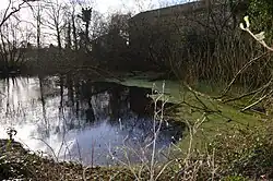 The pond is shaded by willow trees and sycamores, and it is covered by common duckweed. It has many amphibians, including great crested newts and common frogs.[2][1]