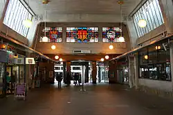 The stained glass panels by Erwin Bossanyi at the booking hall end of the platforms reflect the area's heraldic associations.[7] The crown and three seaxes on a red background are the arms of Middlesex County Council and the chained swan on a black and red background is associated with Buckinghamshire. The centre shield is possibly the arms of the local Basset family; a downward-pointing red triangle on a gold background was borrowed from the Bassett arms for use on the arms of Uxbridge Urban District Council in 1948.