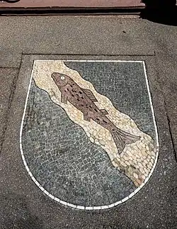 The blazon of the coat of arms reads: "In blue, a golden oblique wave beam, within it a red trout swimming upwards."